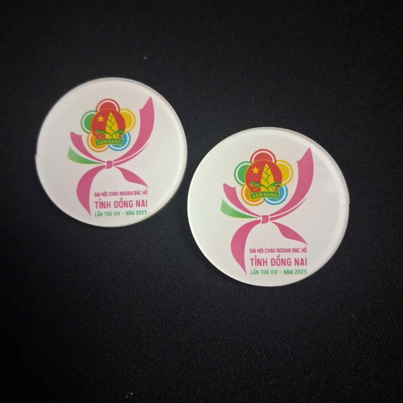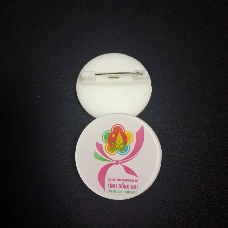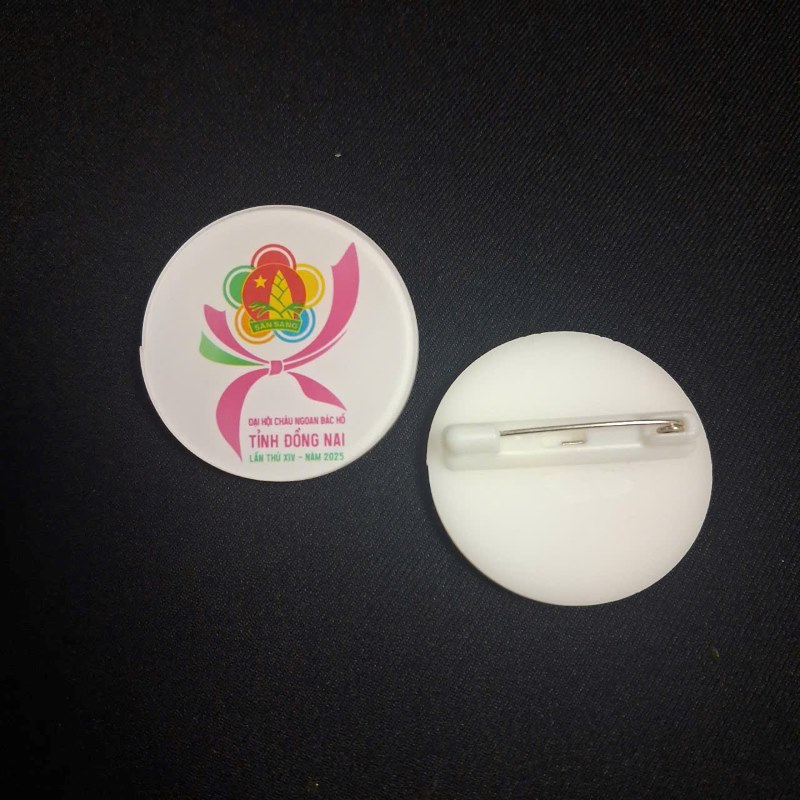 Huy hiệu ghim cài là sản phẩm được làm từ mica hoặc kim loại, phía sau gắn kim cài chắc chắn để dễ dàng ghim lên áo, balo, túi xách. Sản phẩm thường được in logo, slogan, hình con vật hoặc thông tin chương trình theo yêu cầu.