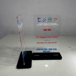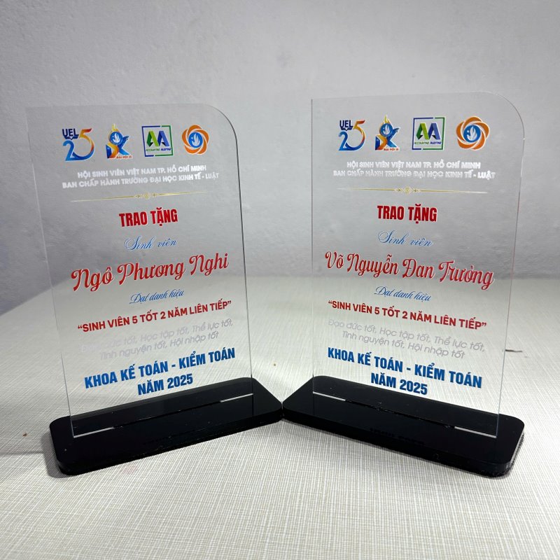 Kỷ niệm chương mica được nhiều đơn vị lựa chọn nhờ giá thành hợp lý, phù hợp với ngân sách của cả doanh nghiệp lẫn cá nhân. So với các chất liệu như pha lê hay kim loại, mica có chi phí sản xuất thấp hơn nhưng vẫn đảm bảo tính thẩm mỹ và độ bền. Đặc biệt, khi đặt làm số lượng lớn tại xưởng, giá thành càng được tối ưu, giúp tiết kiệm chi phí mà vẫn mang lại sản phẩm trang trọng, chỉn chu cho các sự kiện, lễ vinh danh và chương trình khen thưởng.